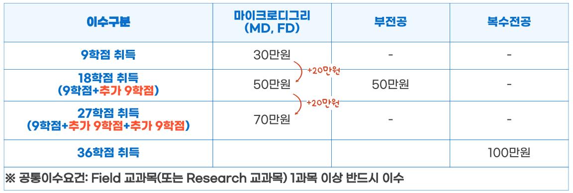 - FD는 신청 연합전공 내 Field 교과목 만으로 9학점 이수 시 이수증 발급